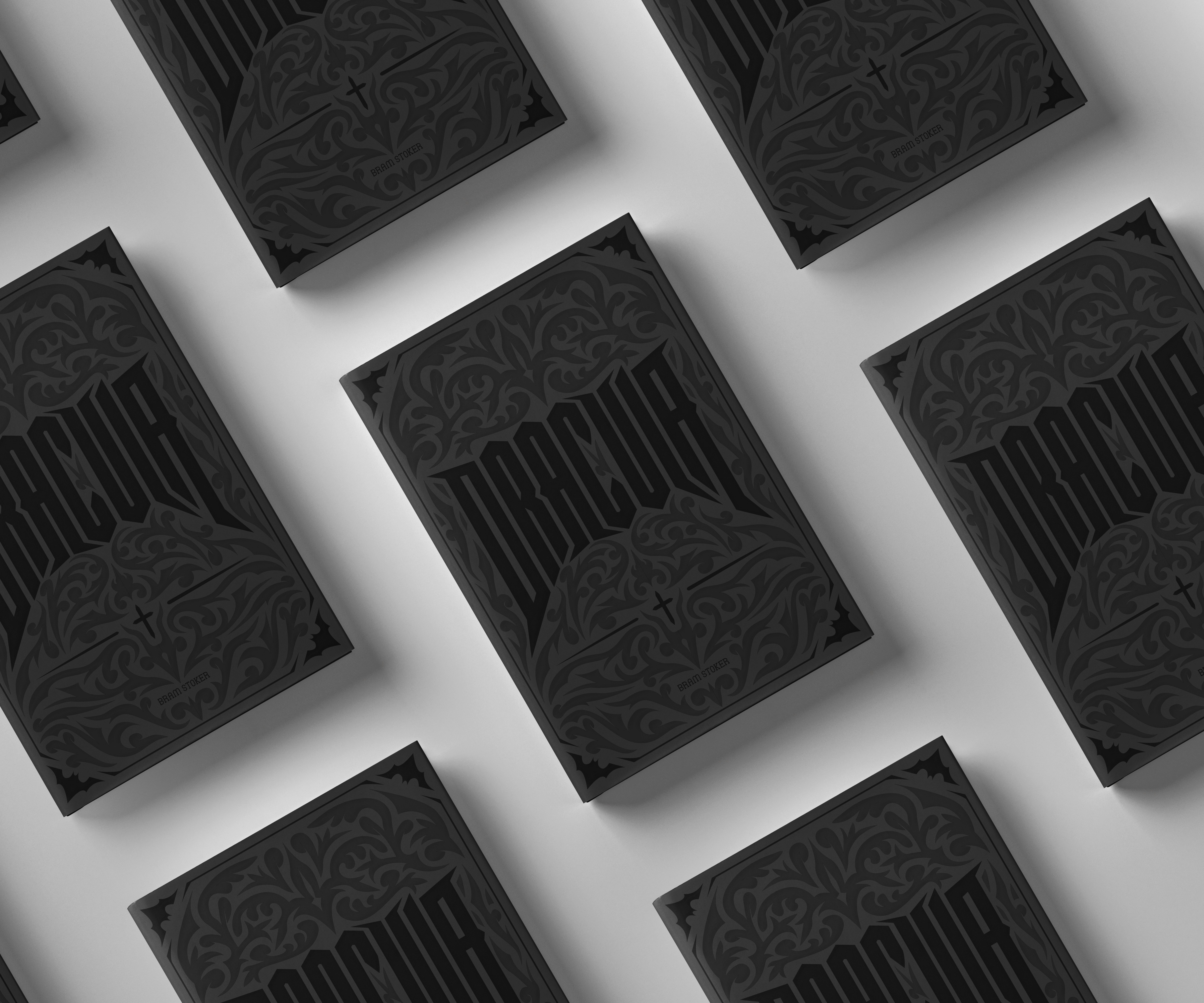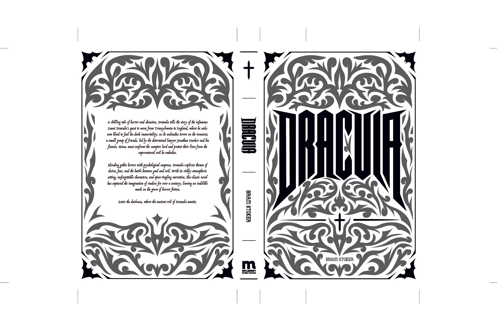 I hand illustrated the text and pattern for the covers, using bold and sharp text and drew a gothic ornamental pattern to wrap around and compliment the title.