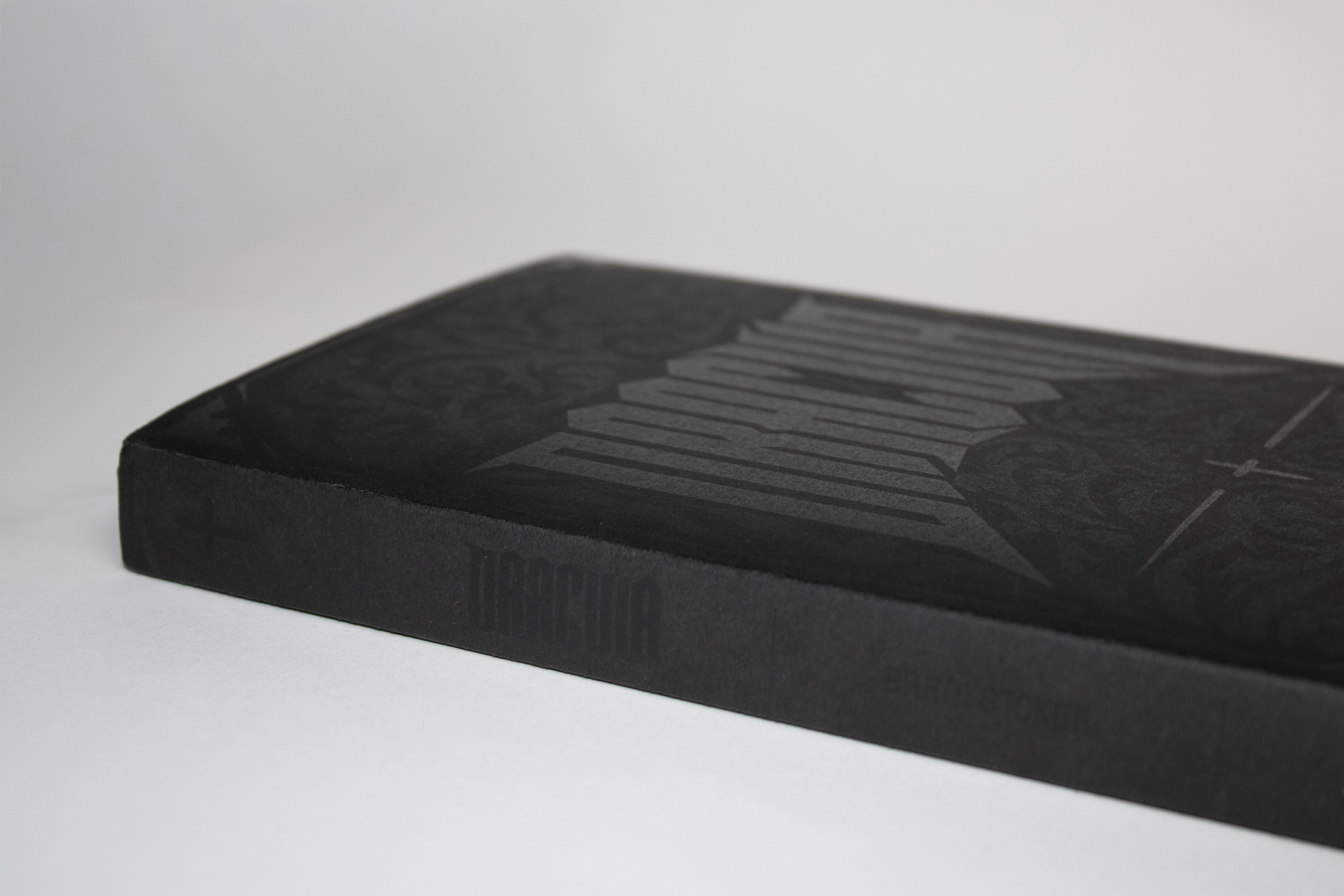I then printed black on black, with the ink making the details in the design reflective in contrast to the matte black paper and replicating a foil stamping effect.